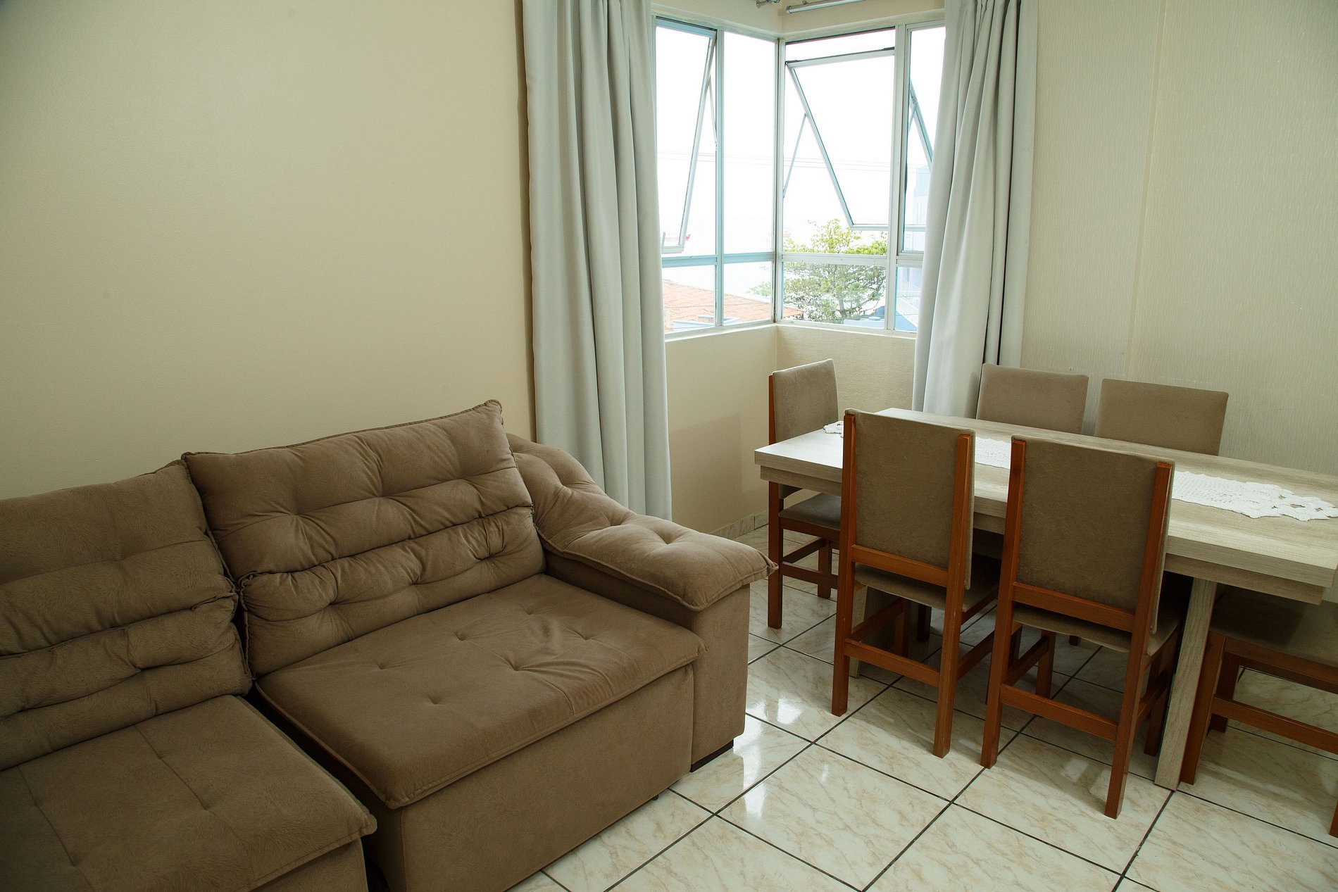 O apartamento tem capacidade para até 06 pessoas em 02 dormitórios (incluindo crianças de qualquer idade), com cozinha, sala, área de serviço, churrasqueira, sacada e garagem.
