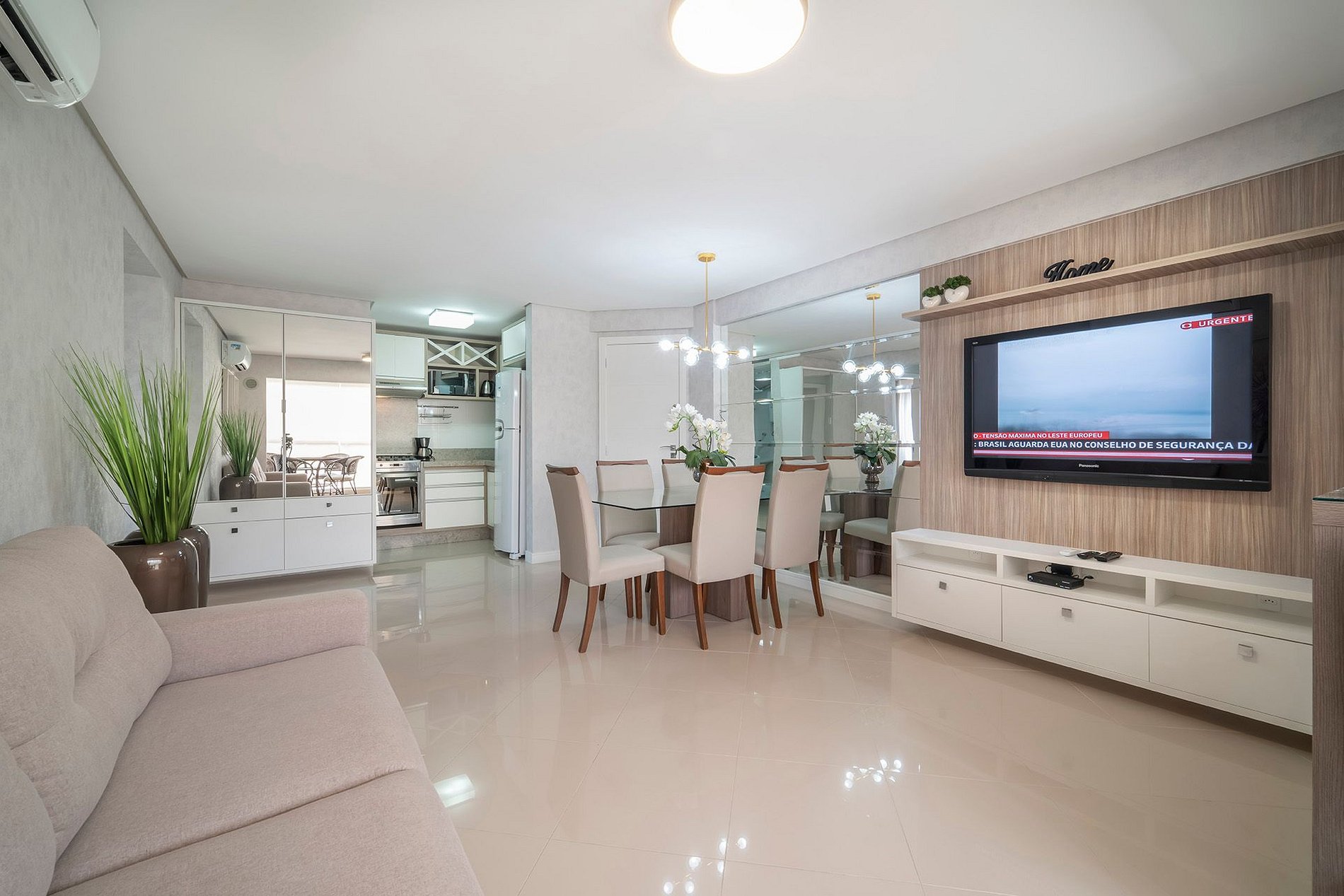 O apartamento tem capacidade para até 06 pessoas em 02 dormitórios (incluindo crianças de qualquer idade), com cozinha, sala, área de serviço, churrasqueira, sacada e vaga para 01 carro em garagem não coberta.