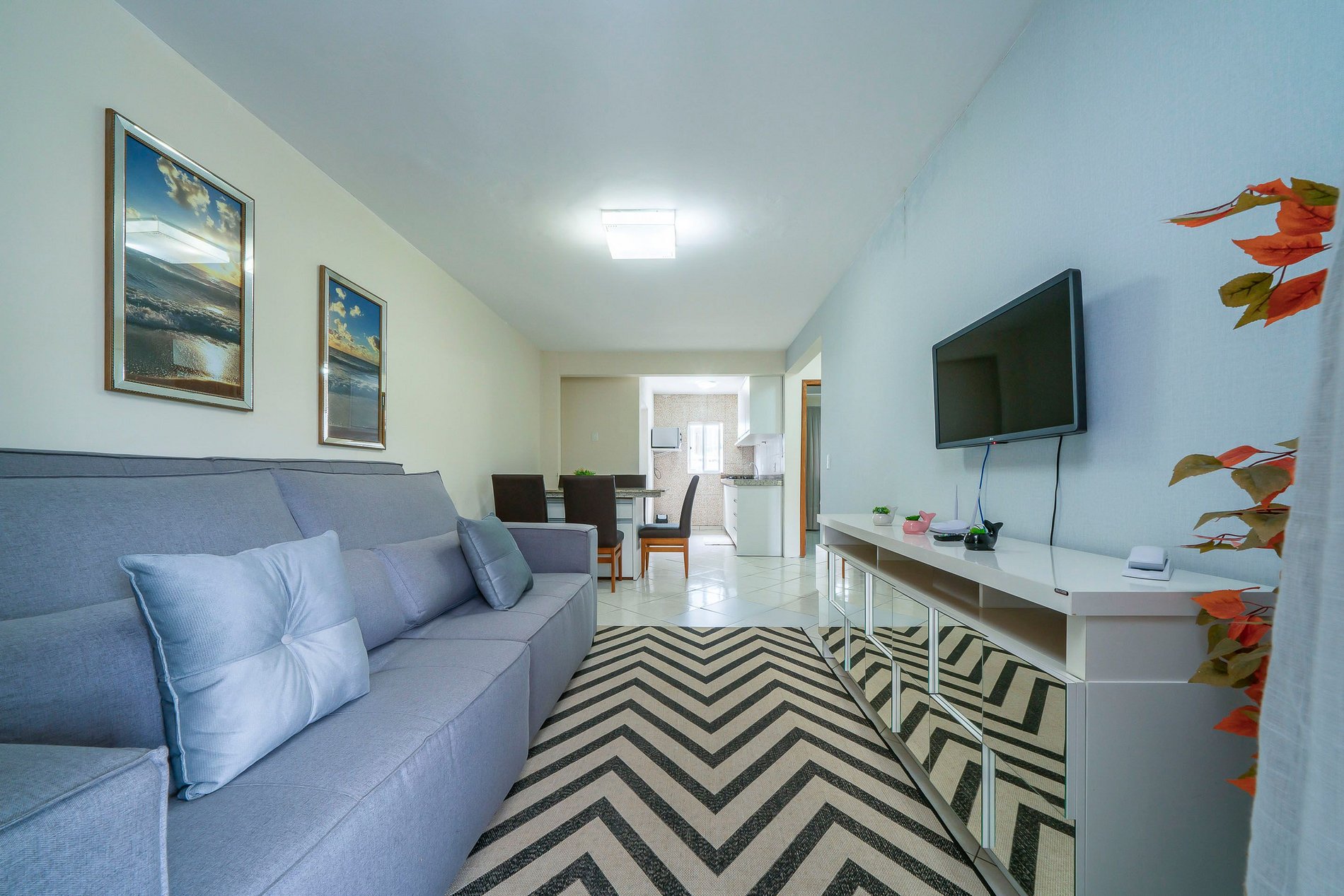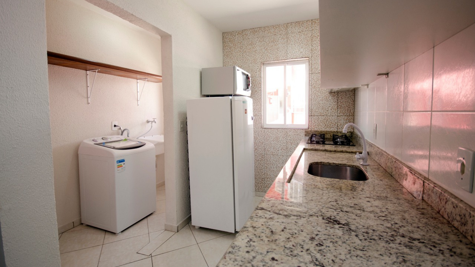O apartamento tem capacidade para até 06 pessoas em 02 dormitórios (incluindo crianças de qualquer idade), com cozinha, sala, área de serviço, churrasqueira, sacada e vaga para 01 carro em garagem não coberta,