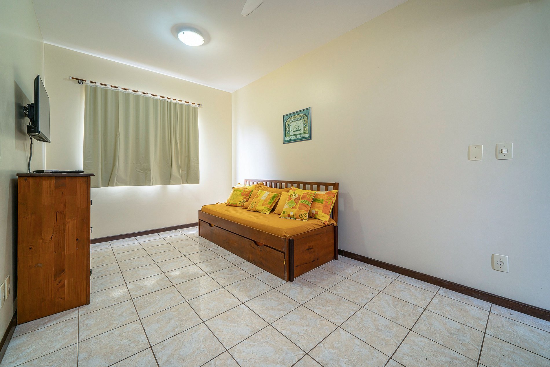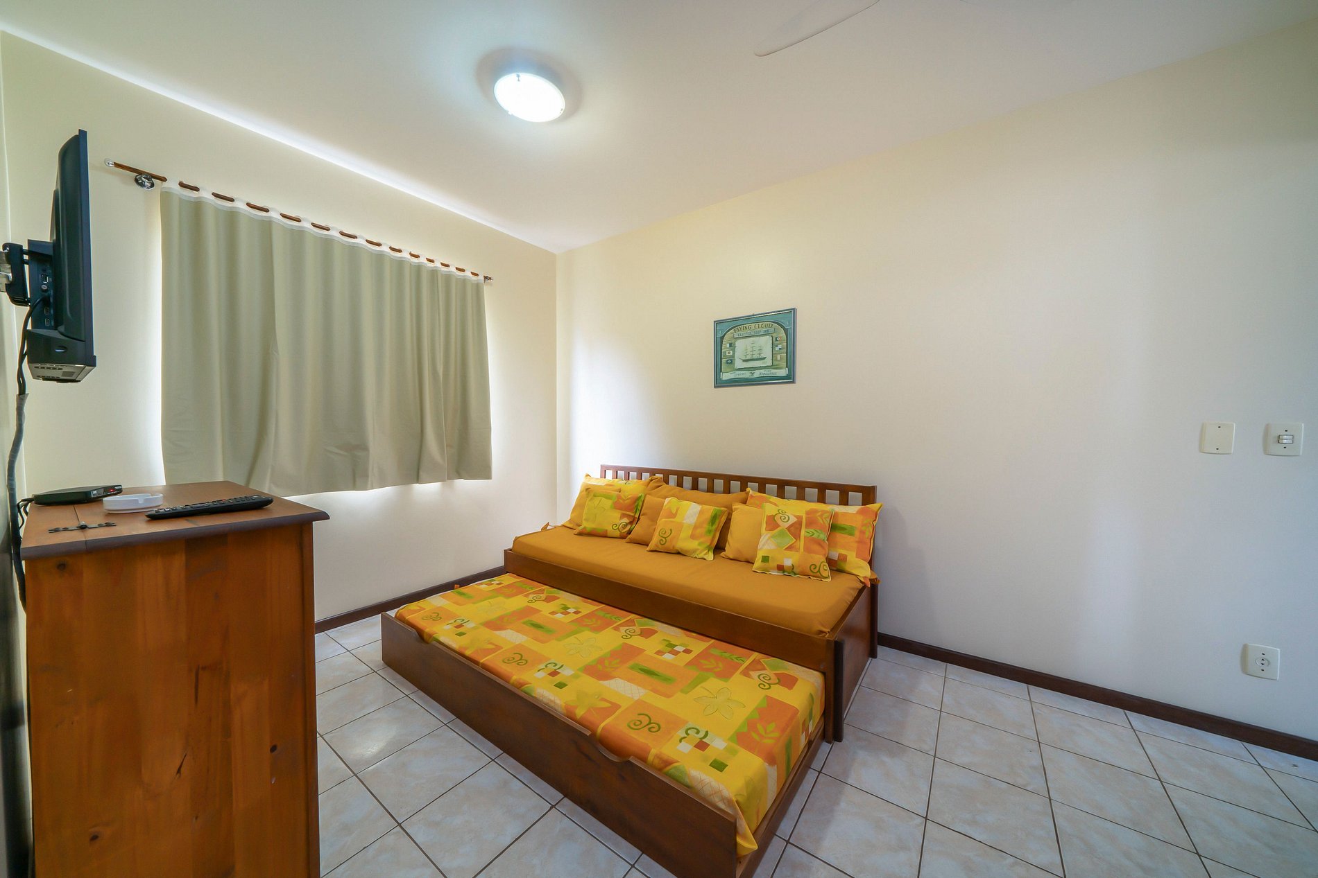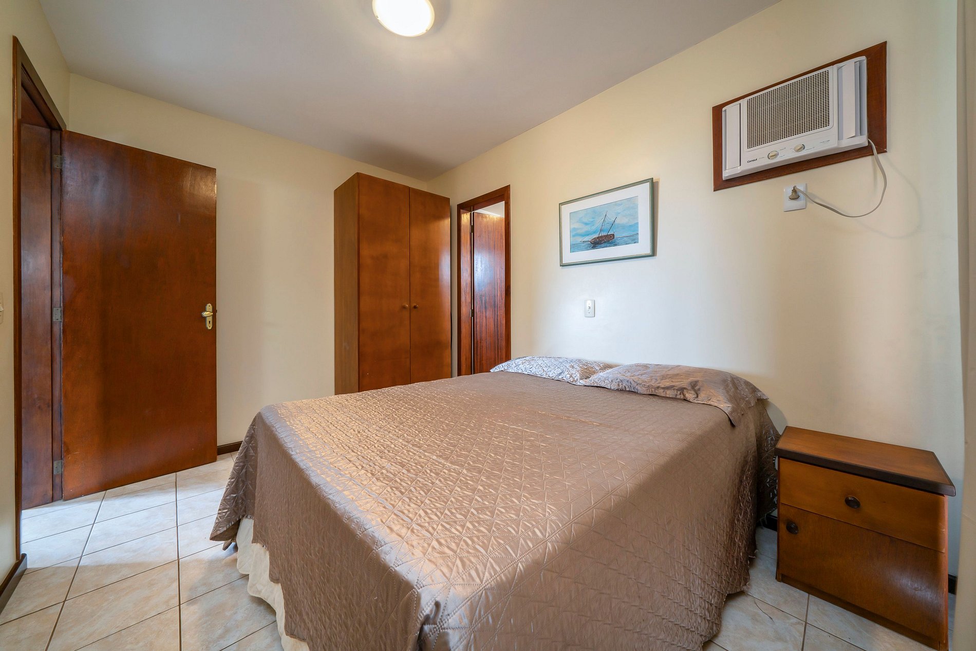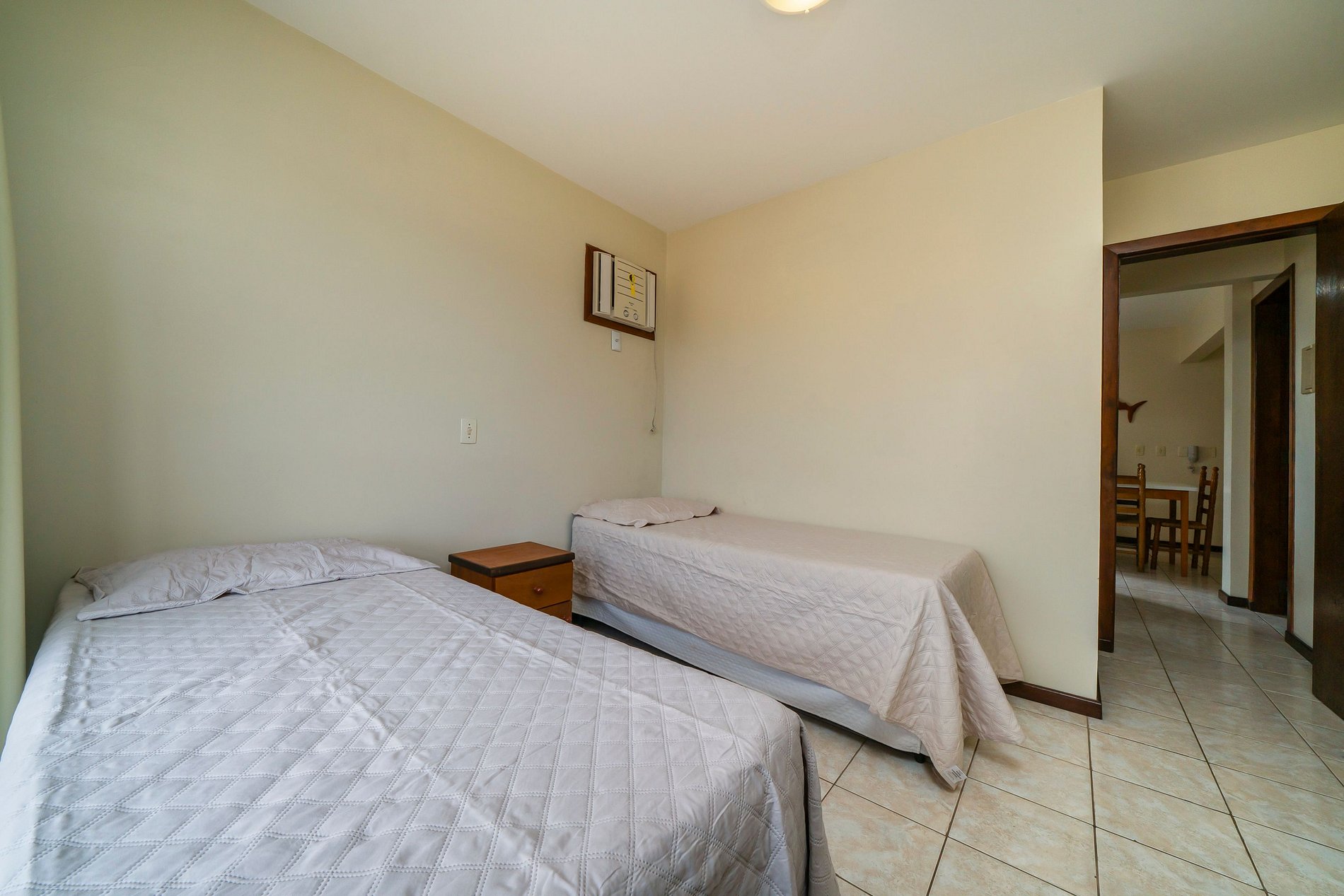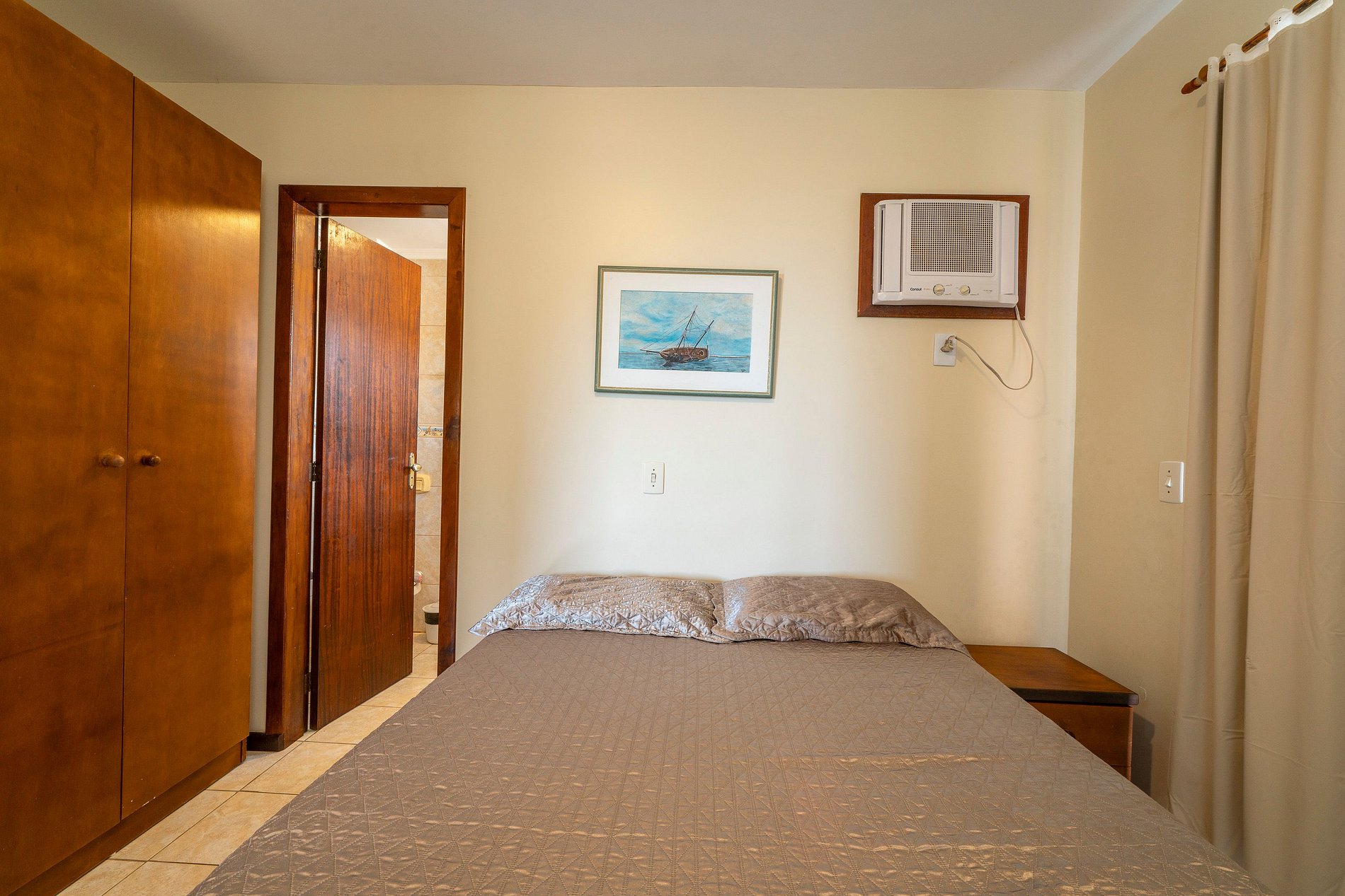 - 02 quartos sendo uma suite com cama de casal e 01 quarto com 2 camas de solteiro;