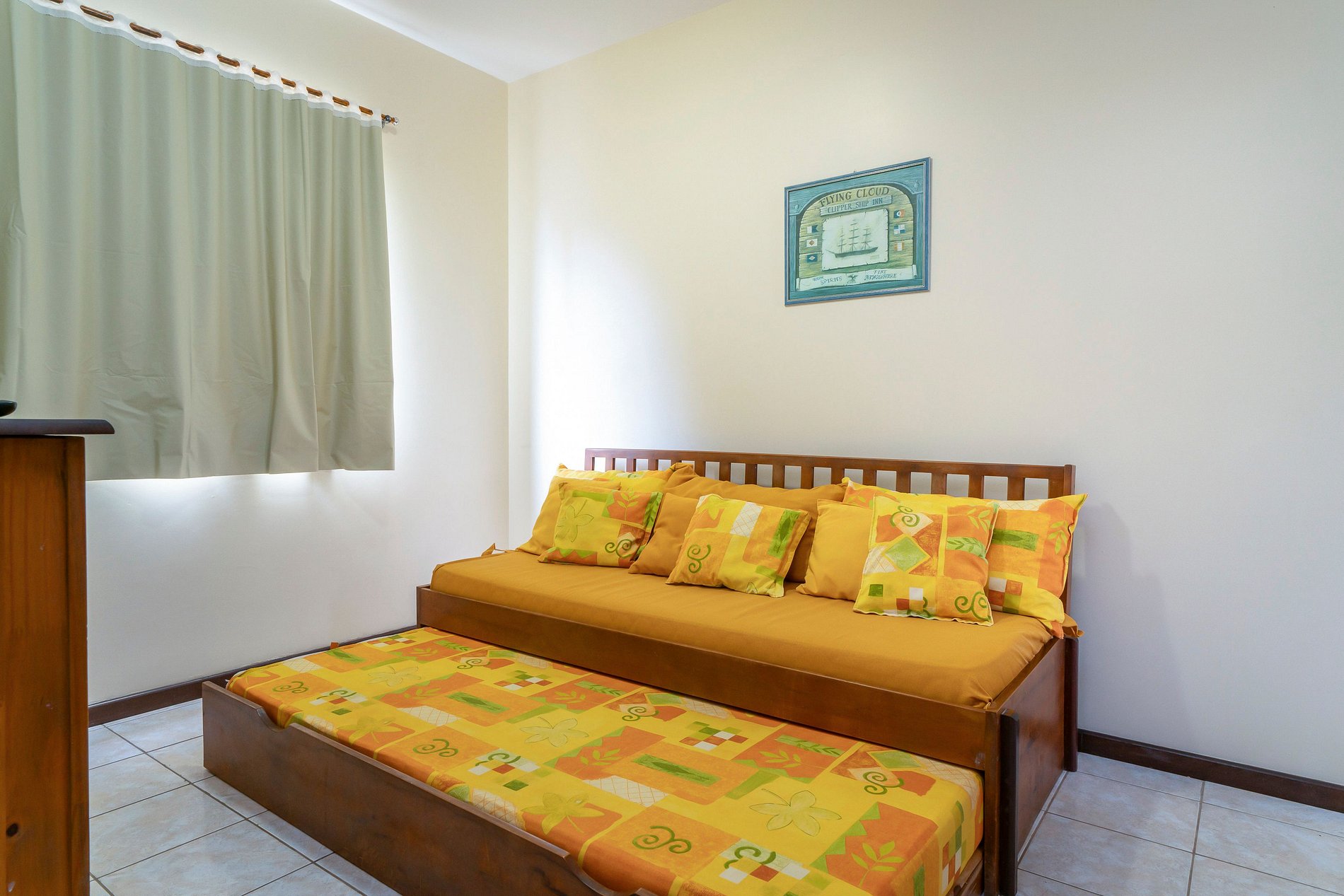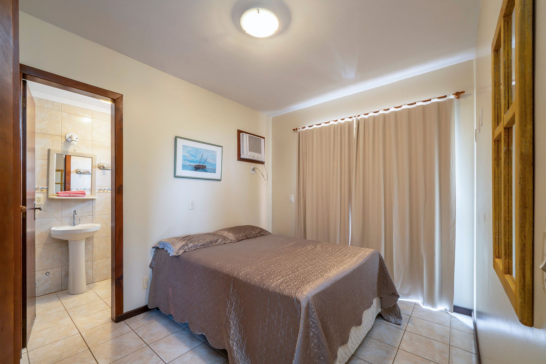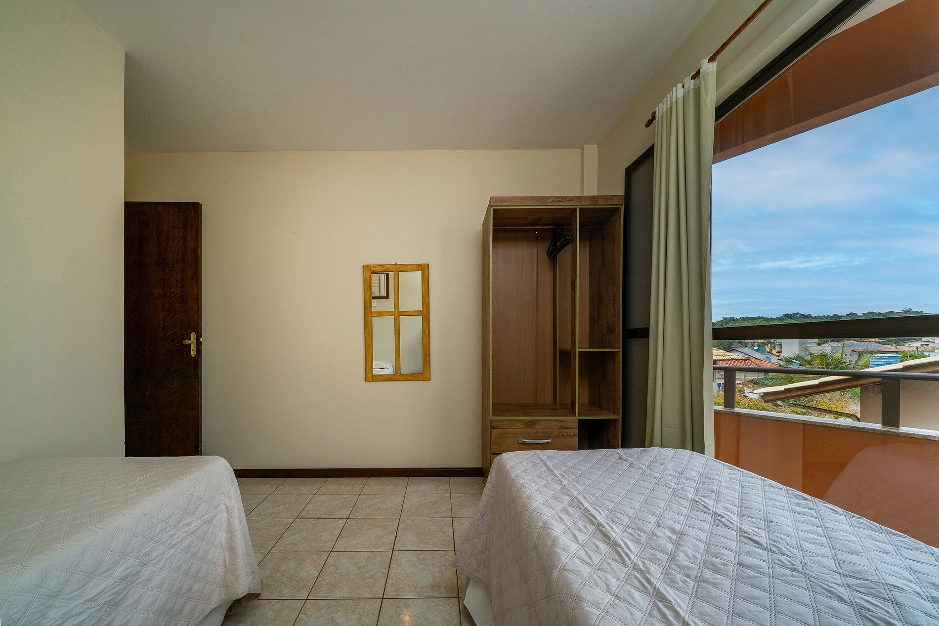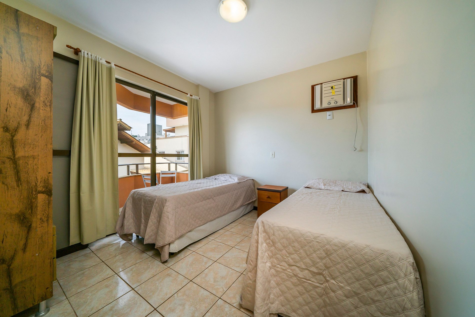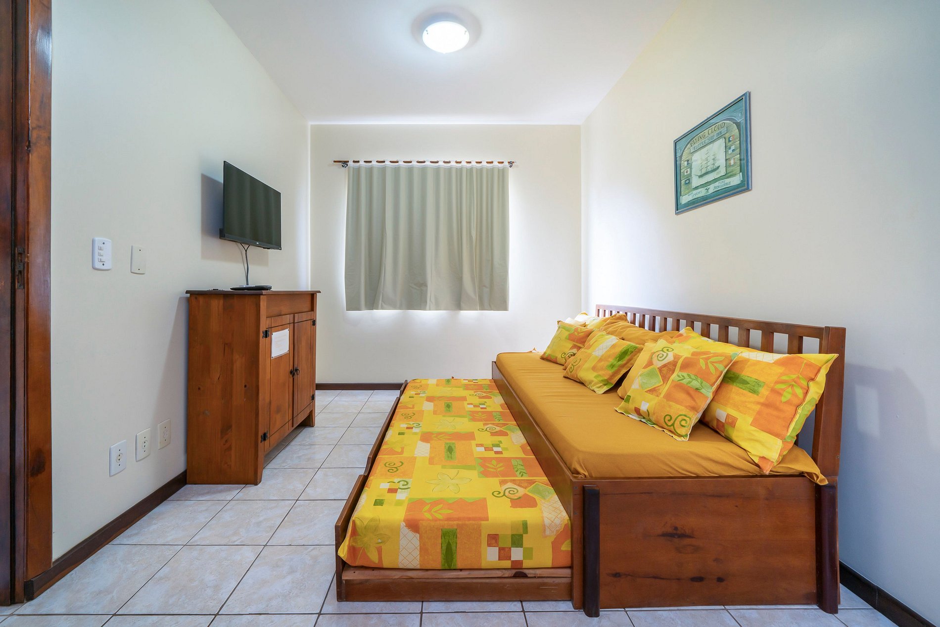 - 02 quartos sendo uma suite com cama de casal e 01 quarto com 2 camas de solteiro;