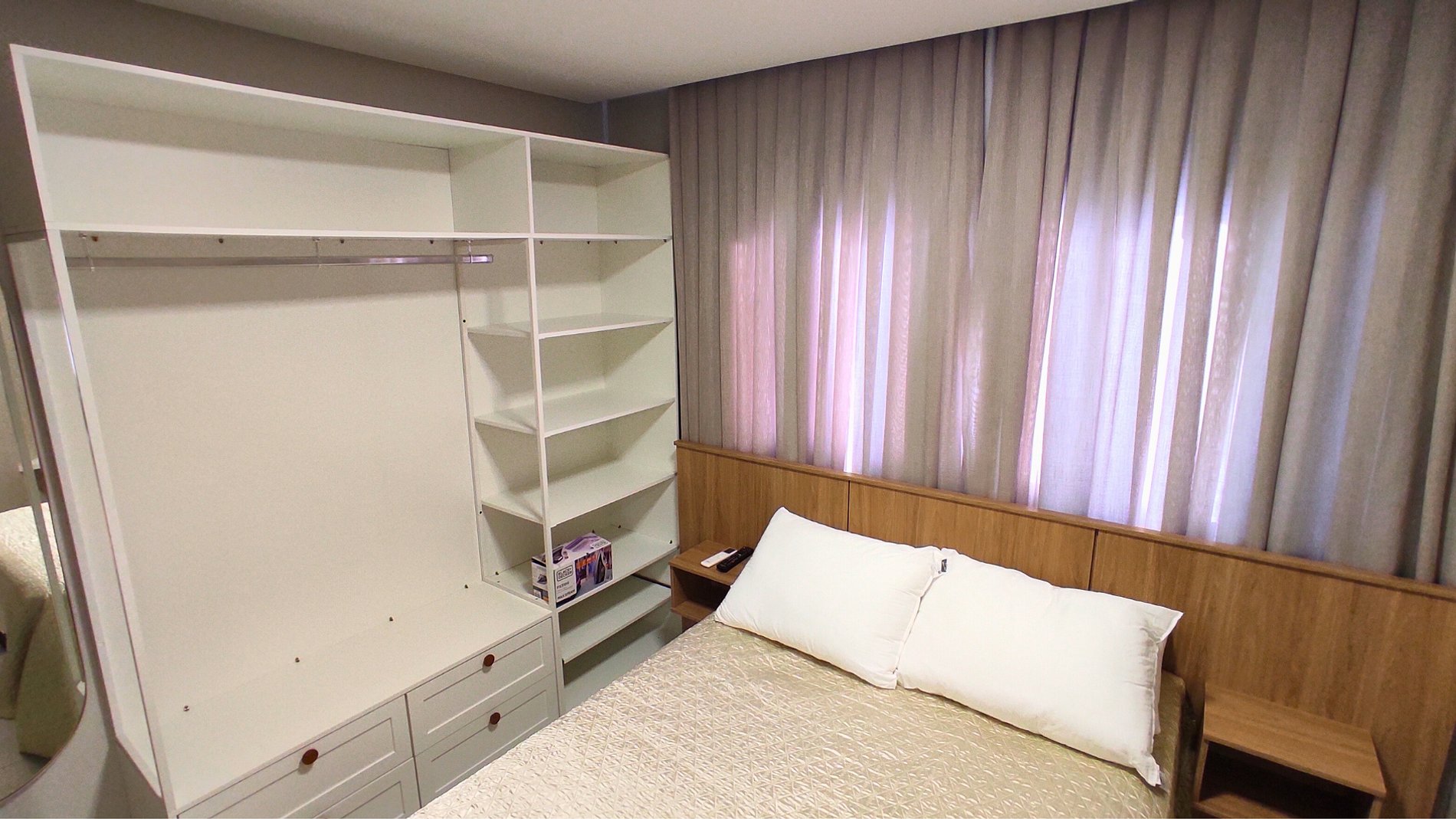- 01 quarto com cama box de casal, guarda roupa e Smart TV e com ar condicionado split;